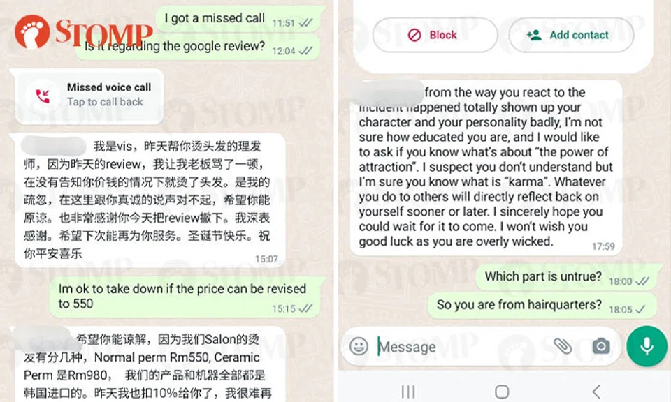 The Stomper said that after her experience was posted on Stomp, she received a message from a woman who is believed to be an employee at the salon.