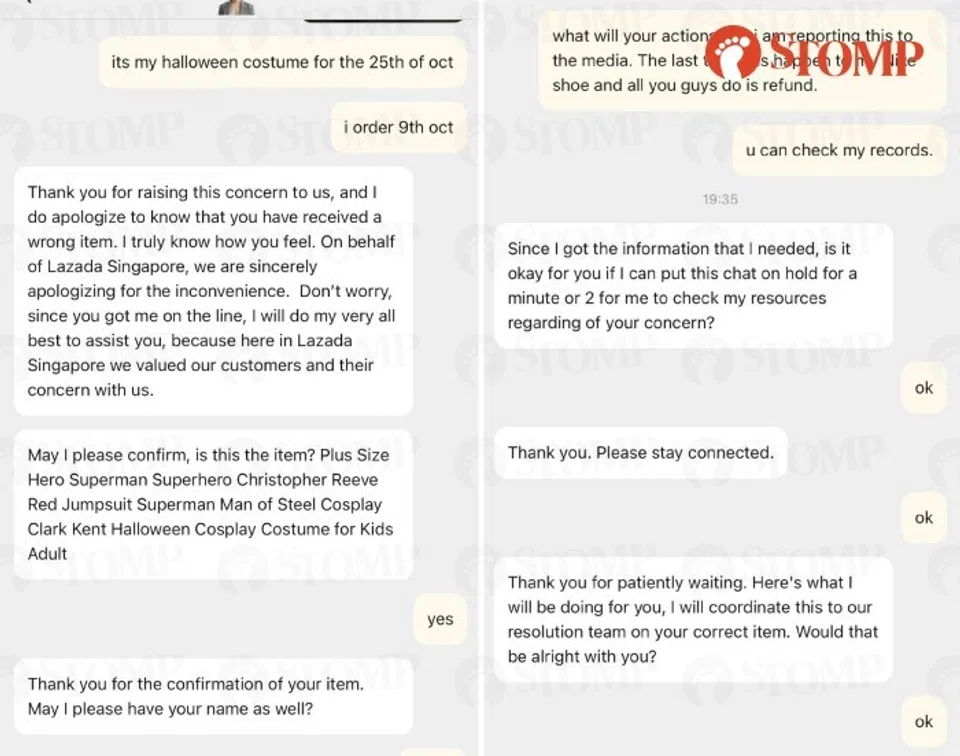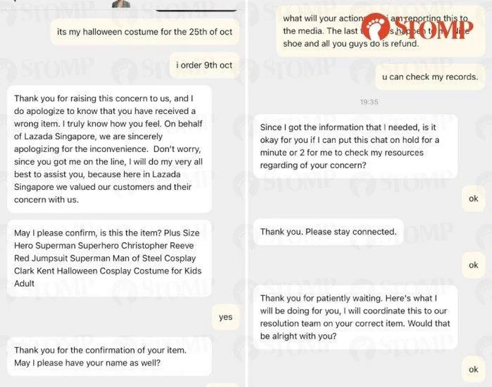 "I ordered a Superman costume from a seller called No Regrets Sports & Outdoors on the Lazada platform on Oct 9, which cost $90," recounted the Stomper.