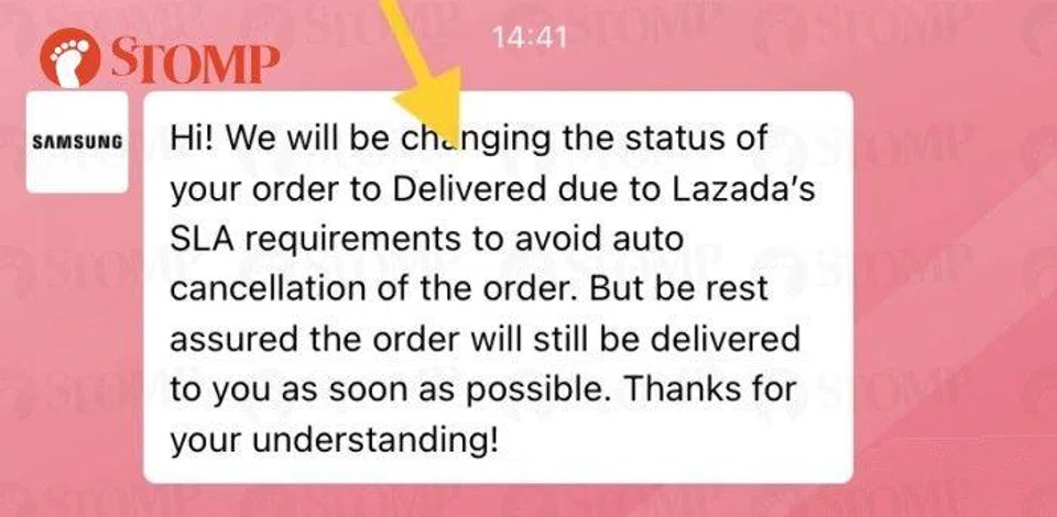 "In the message, Samsung said very clearly they will treat my TV as 'delivered', but they will send it later 'as soon as possible'. This is because of the Lazada refund policy whereby a refund will be made if there’s a delay in delivery.