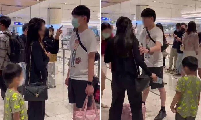 A woman was caught on camera giving her husband a tongue-lashing after ambushing him and his female companion at Changi Airport.