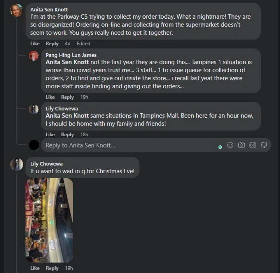 There were long lines at more than one Cold Storage location as people waited for reportedly up to three hours to collect their pre-ordered Christmas food on the eve of the holiday.