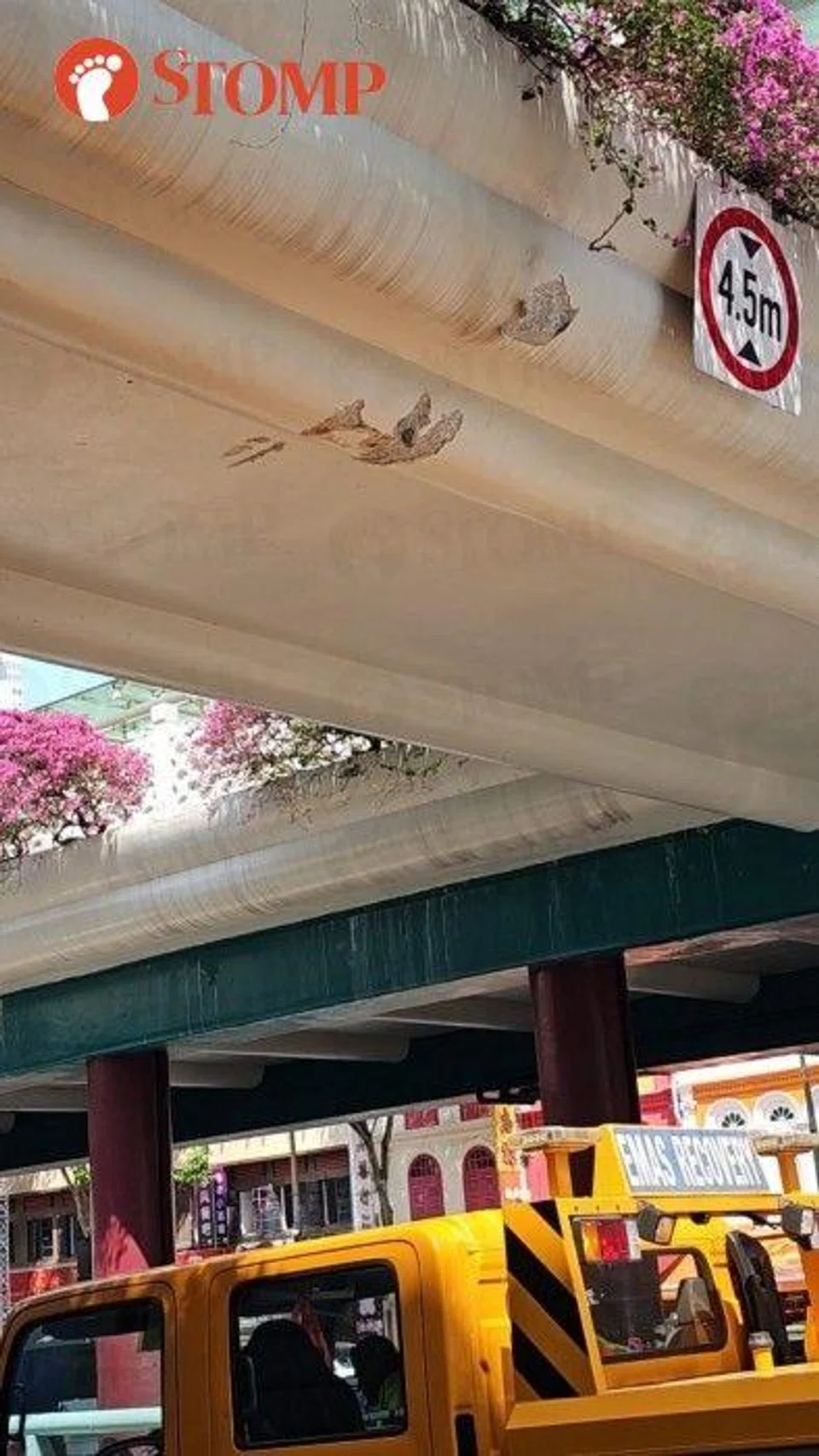 Stomper Vincent alerted Stomp to the incident and shared photos, including the damage caused by the crane to the overhead bridge along Eu Tong Sen Street towards Hill Street.
