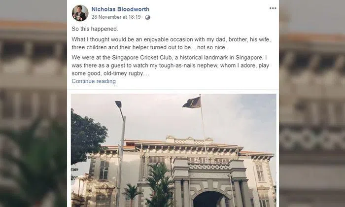 On Monday (Nov 26), freelance actor Nicholas Bloodworth recounted in a Facebook post how his family, along with his brother's maid, Mary, had gone to a restaurant in the Singapore Cricket Club (SCC) last Friday for dinner, only to be told by a staff member that "they don't allow maids here".