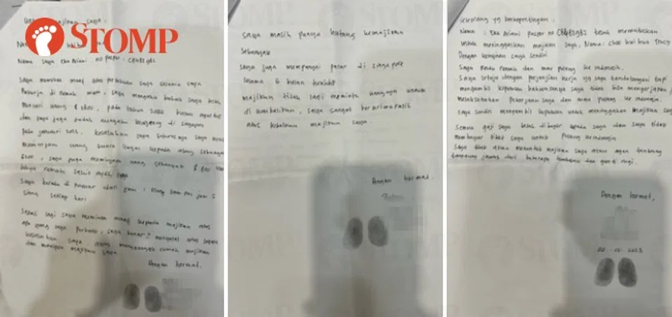"In the letter, she admitted not only stealing, but also sleeping from noon to 5pm every day, borrowing money from me and Ah Long coming to my home.