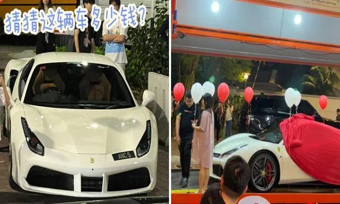 In the video, a man guides his wife over to a car draped in red cloth. Together, they unveil the car – a white Ferrari 488 GTB that costs over RM1.2 million (S$350,000).
