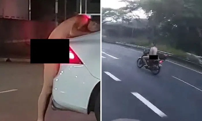 In one video, the man is seen riding a motorcycle without any clothes or a helmet on.