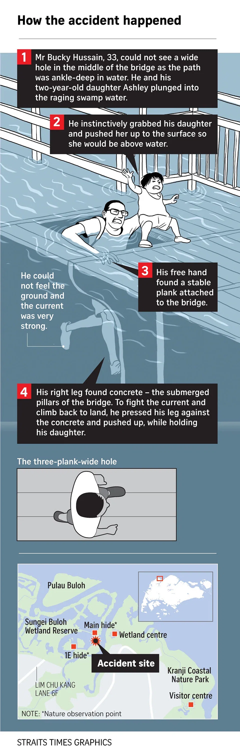 Mr Lim said the overflowing waters at the peak of the spring tide, coupled with heavy rain, had dislodged the floor panels, creating the hole.