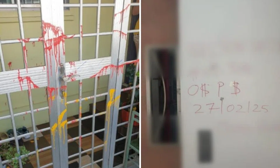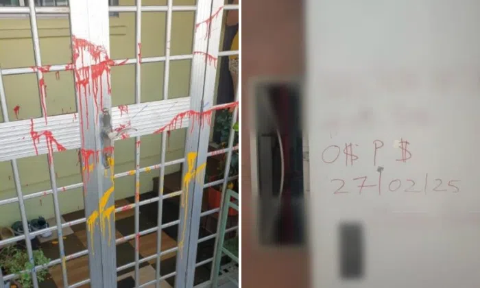 The police were alerted on Feb 27 at about 5.40pm to the case at Tampines Street 22 flat, where the main gate and door were splashed with red and yellow paint.