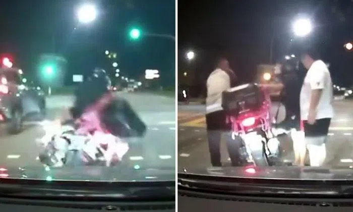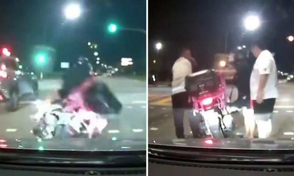 A motorcyclist fell to the ground at a traffic junction in Geylang in the early hours of May 28.