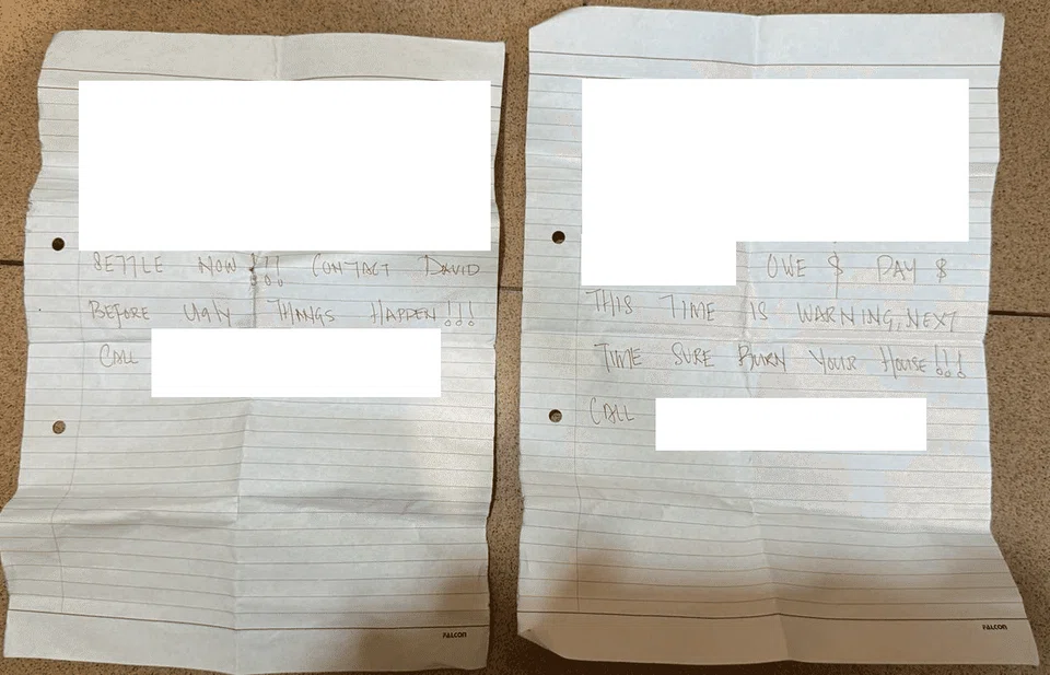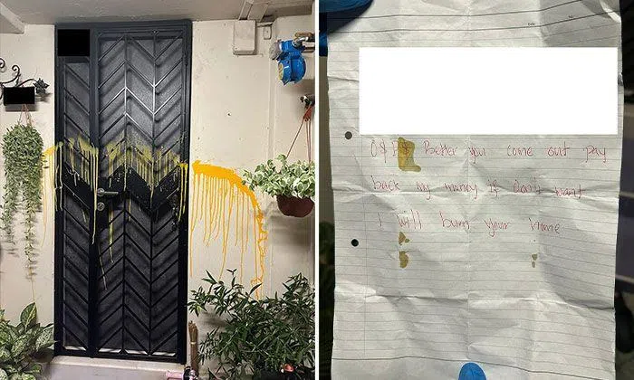 A residential unit at Bedok North Street 2 was found splashed with yellow paint and a debtor's note was placed on its gate.