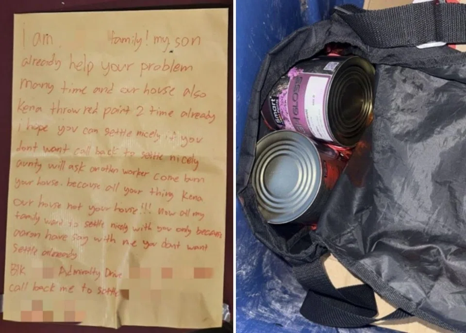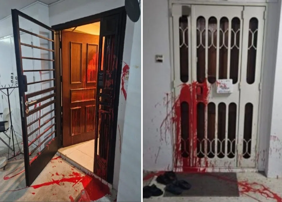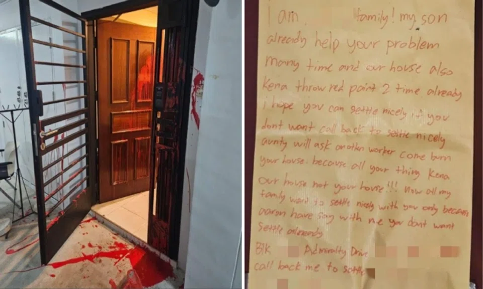The police were alerted to the case of loanshark harassment at Admiralty Drive on Jan 12. The main door and gate of two residential units were splashed with red paint.