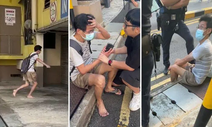 The suspect, who is barefoot, can be seen being chased down into the sheltered carpark of Balestier Plaza while KameHao yells after him, "Why are you running?"