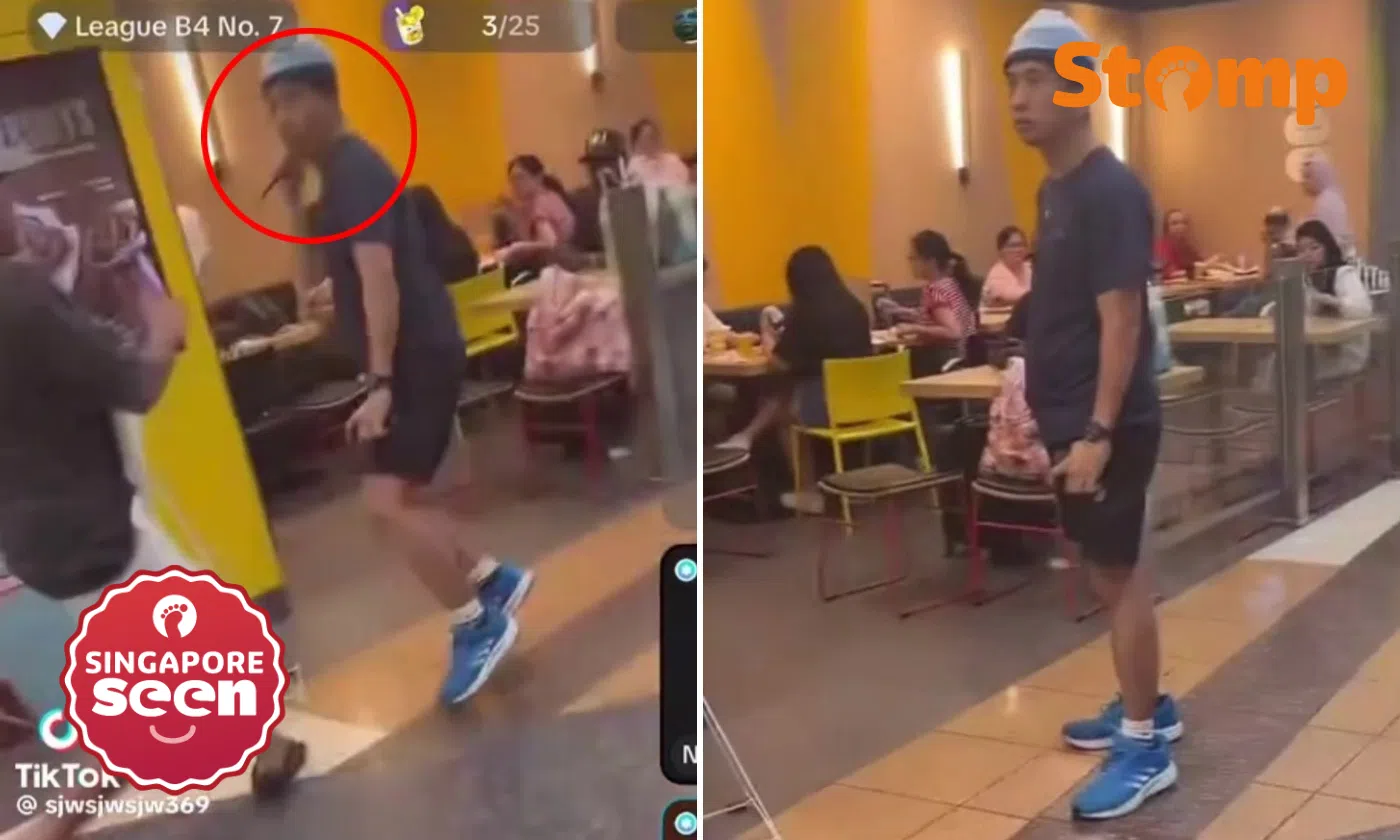 In the video, Gay can be seen brandishing a chopstick like a knife in a confrontation with another person outside the McDonald's outlet in HarbourFront. He is later seen chasing someone through the crowd in the mall.