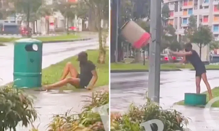 In a video posted online by Beh Chia Lor on Jan 17, the man in a black cap, black mask, black tee and black shorts can be seen getting up from the ground and dismantling the bin as he threw the parts onto the road one by one.