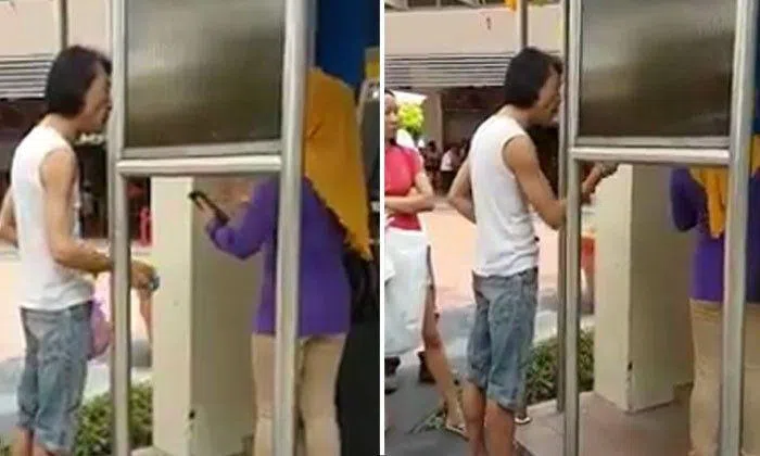 Wearing a singlet and sandals, he stood there scolding the woman with his arms crossed.