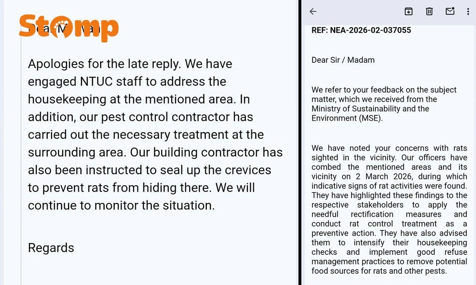 "We will continue to work closely with our pest‑control contractor and relevant agencies to monitor the situation and take further action where necessary to safeguard the cleanliness of the estate," the spokesperson told Stomp.