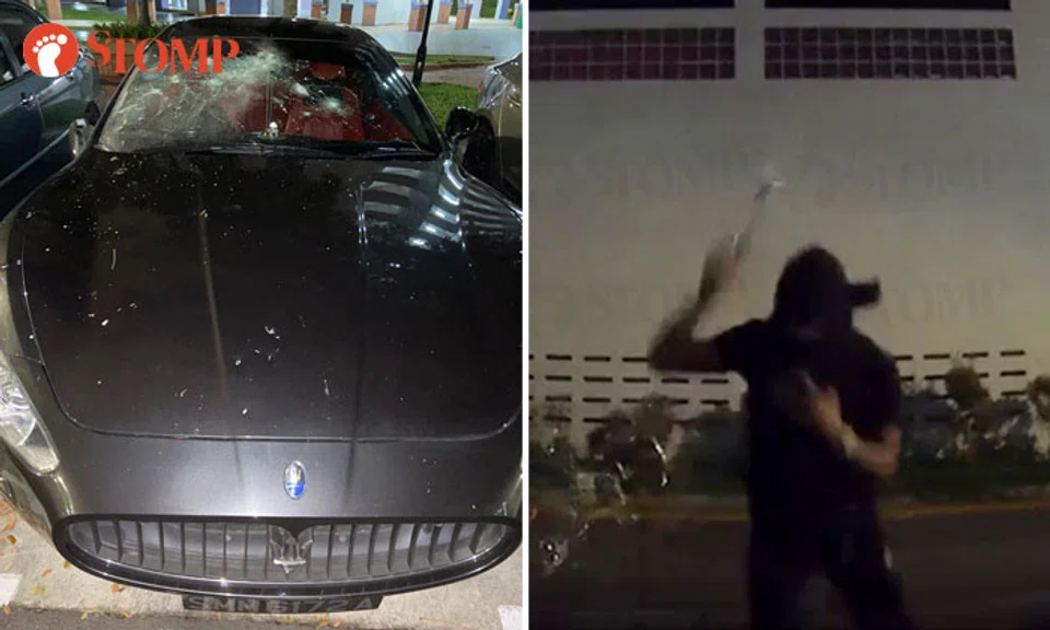 A man was caught on video whacking a Maserati parked at a carpark in Ang Mo Kio with a metal object on May 9.