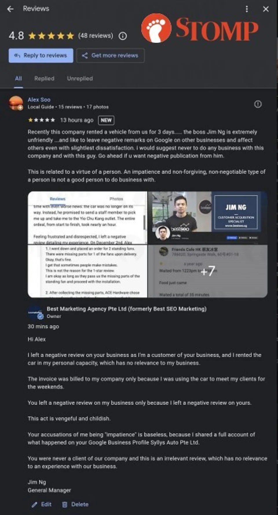As a tit for tat, Mr Soo also posted a one-star Google review of the Stomper's company, Best Marketing Agency.