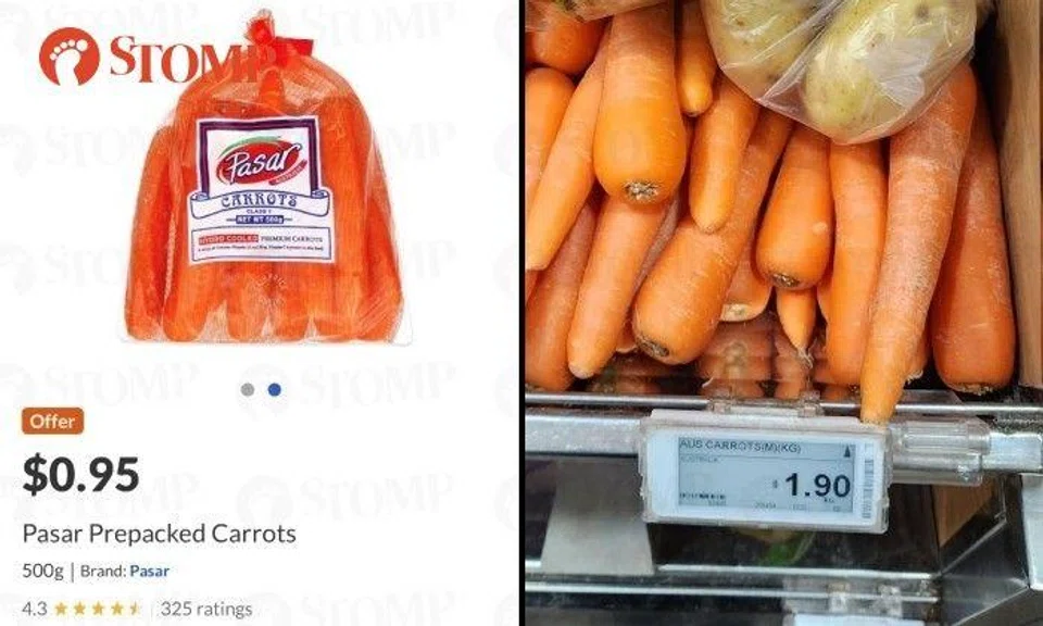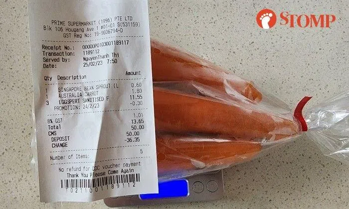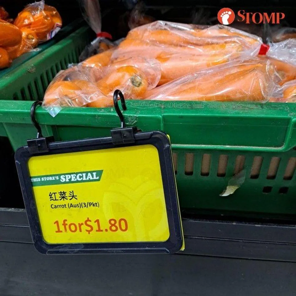 A customer claimed he was overcharged after paying $1.80 for carrots at the Prime Supermarket at Block 106 Hougang Avenue 1.
