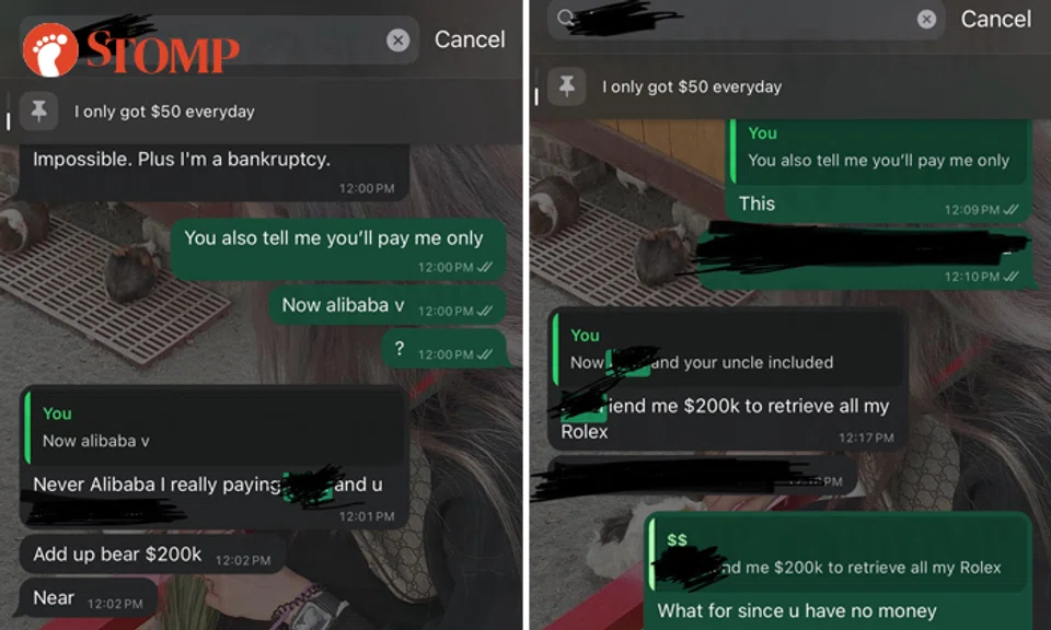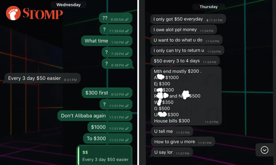He also told her that he "owed a lot of people money," adding: "U tell me. How to give u more. U say lor."