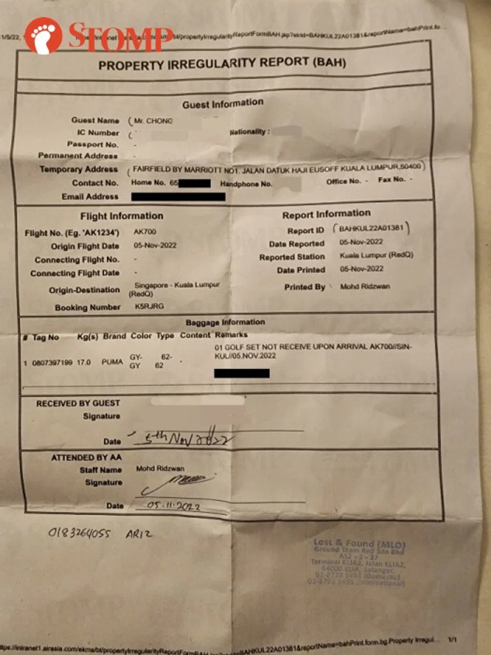 This was especially frustrating for him because he had earlier asked the AirAsia staff at Changi Airport to check on his clubs three times.