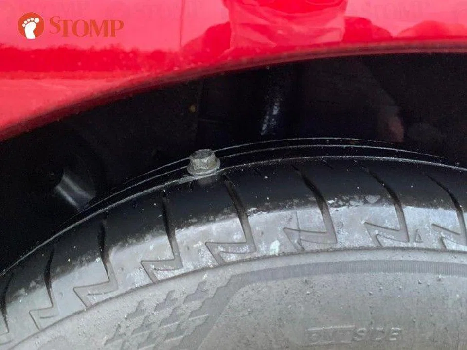 Man frustrated when 11cm-long screw punctures his car tyre at Aviation Park Road
