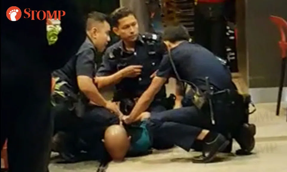 A man was pinned down by police officers at around 3am today (Jul 2) outside a McDonald's restaurant at Rivervale Plaza after allegedly acting aggressively towards diners and staff.