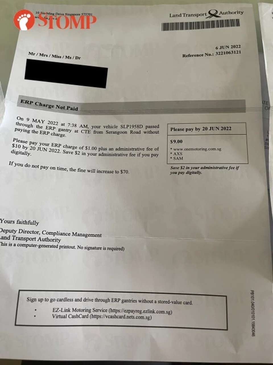 The letters from LTA were both issued on June 6, informing Lim of fines for failing to pay Electronic Road Pricing (ERP) charges on two occasions.