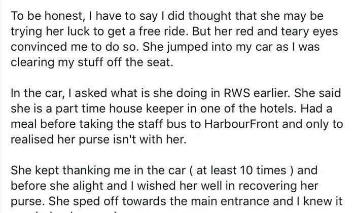 Netizen gives a lift to teary-eyed aunty who left her purse at RWS despite doubting her story at first
