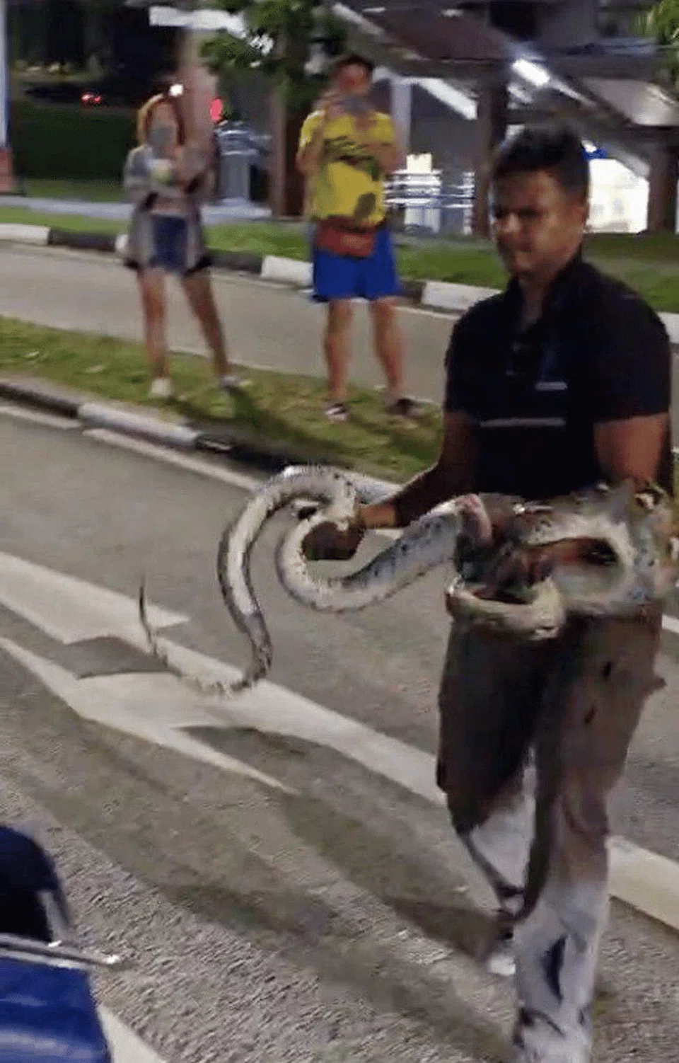 As the python’s actions had frightened a group of about 20 people who had gathered, Mr Yeo helped direct traffic from the road while his 33-year-old son called the police, who arrived within minutes.