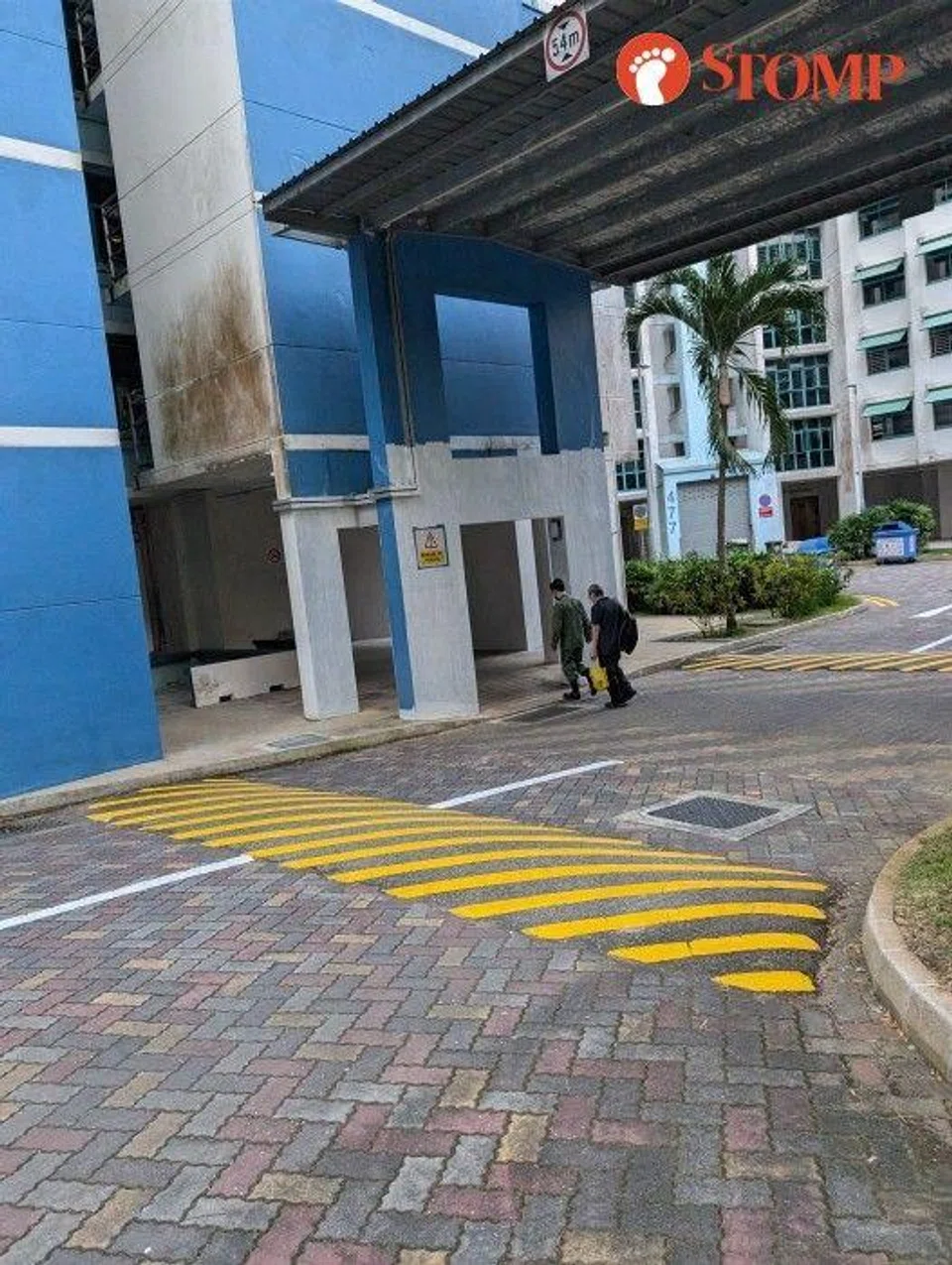 Stomper J shared a photo of the man wearing camouflage walking in front of an elderly man carrying a black backpack and a yellow plastic bag in a Housing Board estate on July 29.