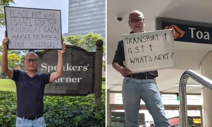 The man is Gilbert Goh Keow Wah who was photographed posing next to the Speakers' Corner with a placard that read: "Peace not war. Israel stop the killing at Gaza! Hamas release all the hostages!"