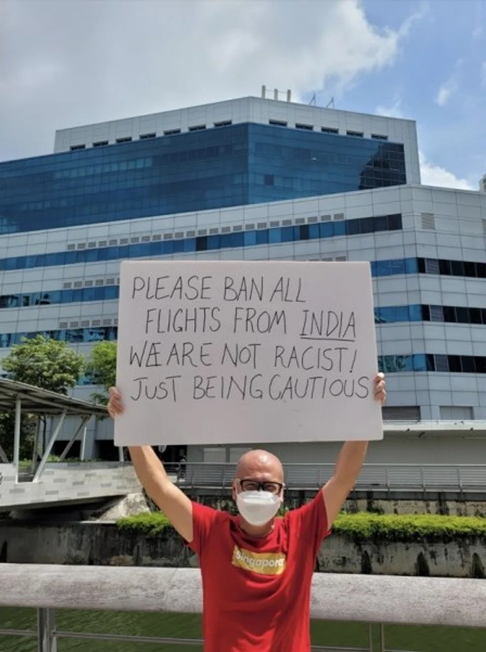 He carried a placard that read: "Please ban all flights from India we are not racist! Just being cautious."