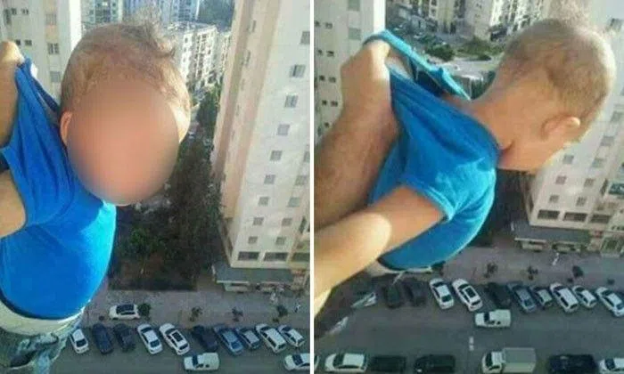 The man, who is reported to be a relative of the boy, posted a photo of himself loosely handling the baby, grasping him by his shirt, as the child was exposed 150 feet above heavy traffic from their 15th floor apartment.