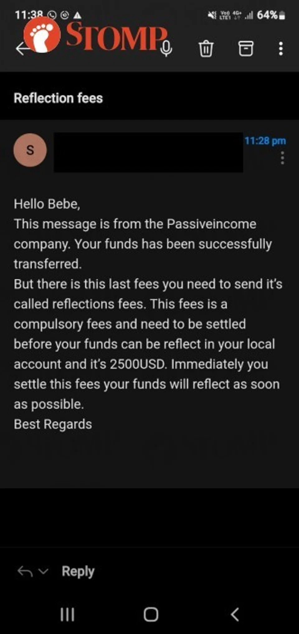 After two to three days, F did not receive any of the money, only an email asking him for another US$2,500, adding that the money in his account had been transferred and he needed to pay the 'reflection fee'.