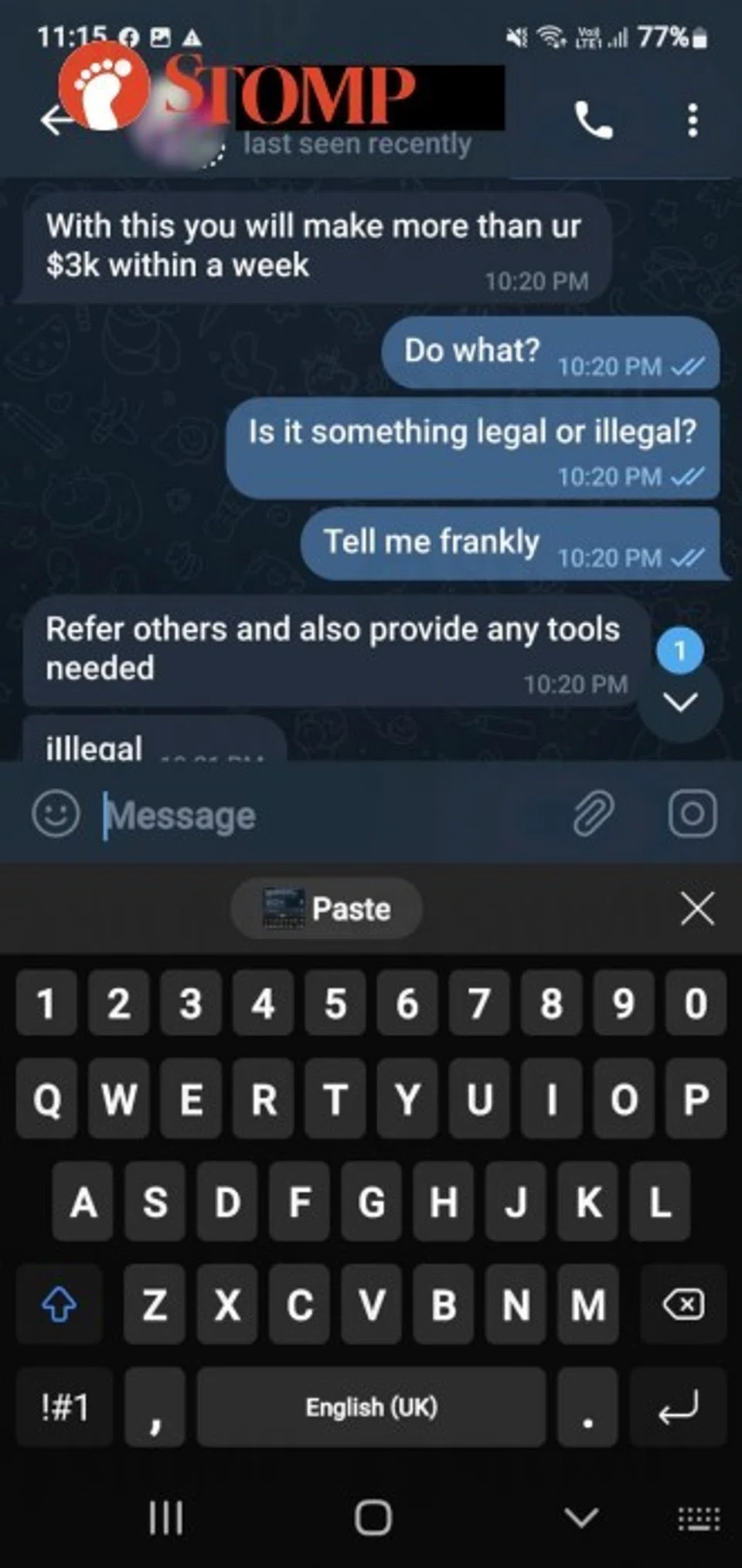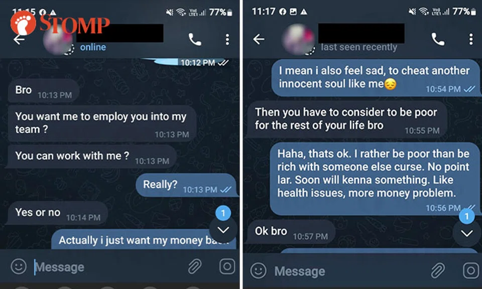 A man who lost US$3,000 (S$4,226) to an investment scam was shocked at the audacity of the alleged scammer when she contacted him again, asking him to join her in an 'illegal business'.