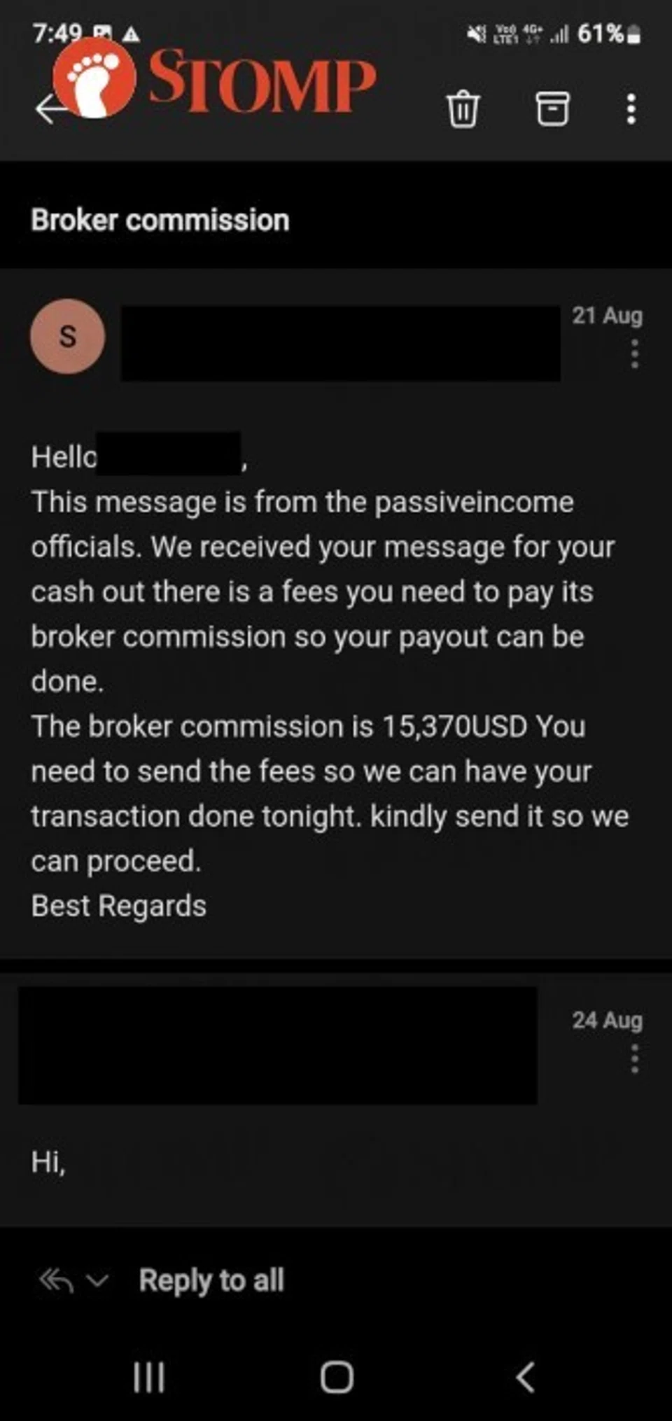 When F applied for the withdrawal through the trading account, he received an email that he needed to pay US$15,370 for the broker commission.