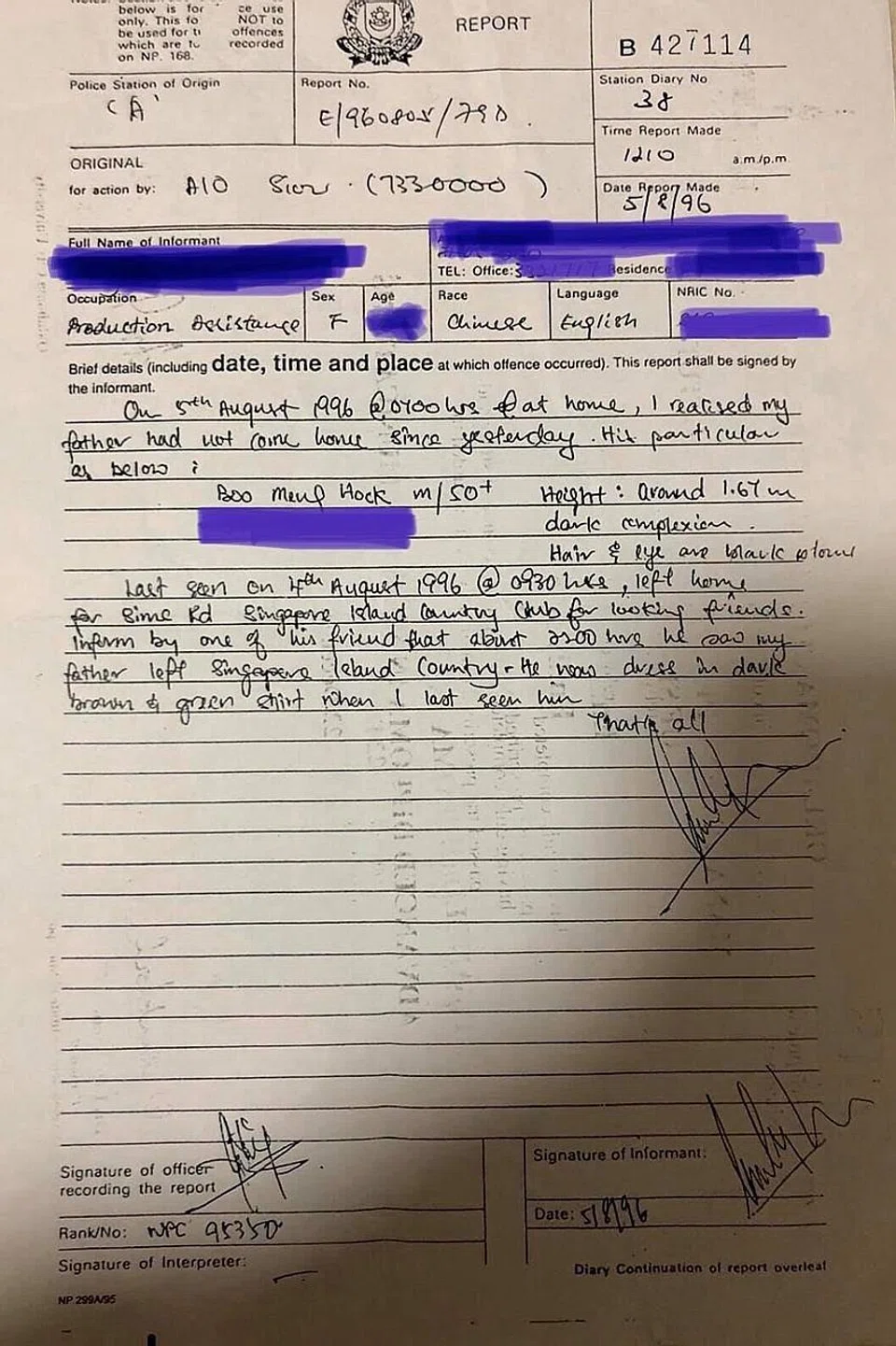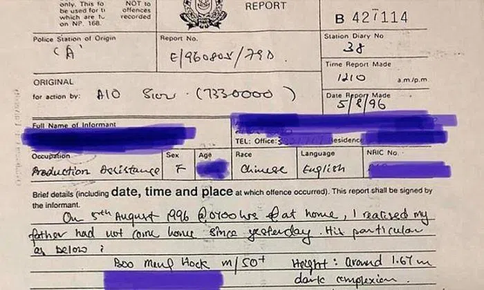 On Aug 5, Ms Boo posted a photo of a police report made in 1996 about her father's disappearance. He was in his 50s.