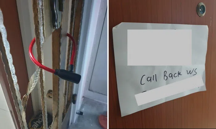 The unit's main gate had been locked with a bicycle lock. A debtor's note had also been pasted on the main door.
