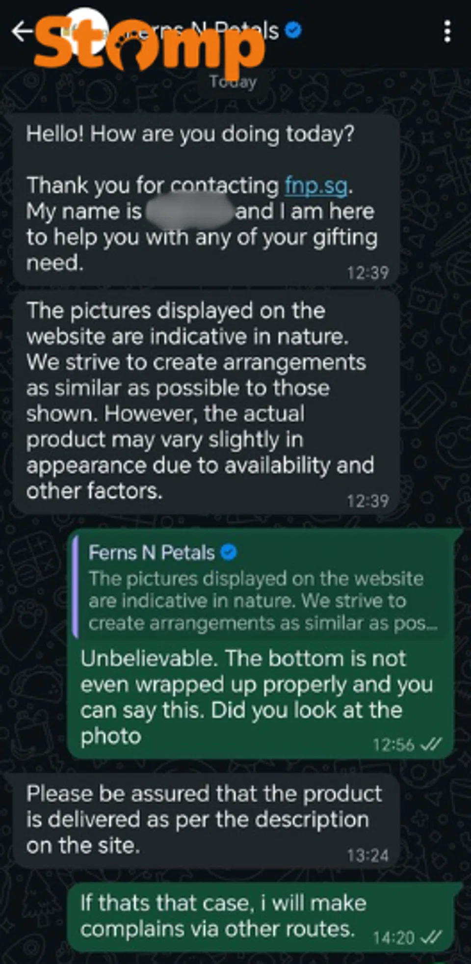 When Mkee reached out to Ferns N Petals Singapore via WhatsApp, he was told that the pictures on the website are "indicative in nature".