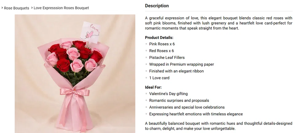 According to its website description, the $59 bouquet is a "graceful expression of love" and "perfect for romantic moments that speak straight from the heart". It consists of six pink roses, six red roses, and leaf fillers wrapped in "premium" wrapping paper and an "elegant" ribbon.