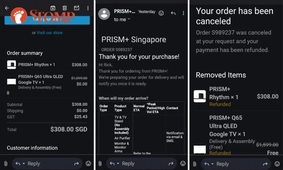 Stomper Rick ordered a 65-inch TV with soundbar for only $308 from the Prism+ website during a 3.3 sale, but his order was subsequently cancelled by Prism+.