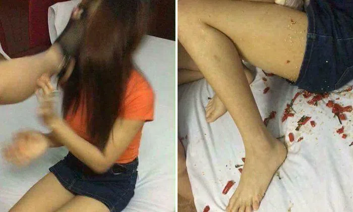 They show the woman getting a kick in her face, as well as chilli peppers smeared on her thighs and the bed that she was sitting on.