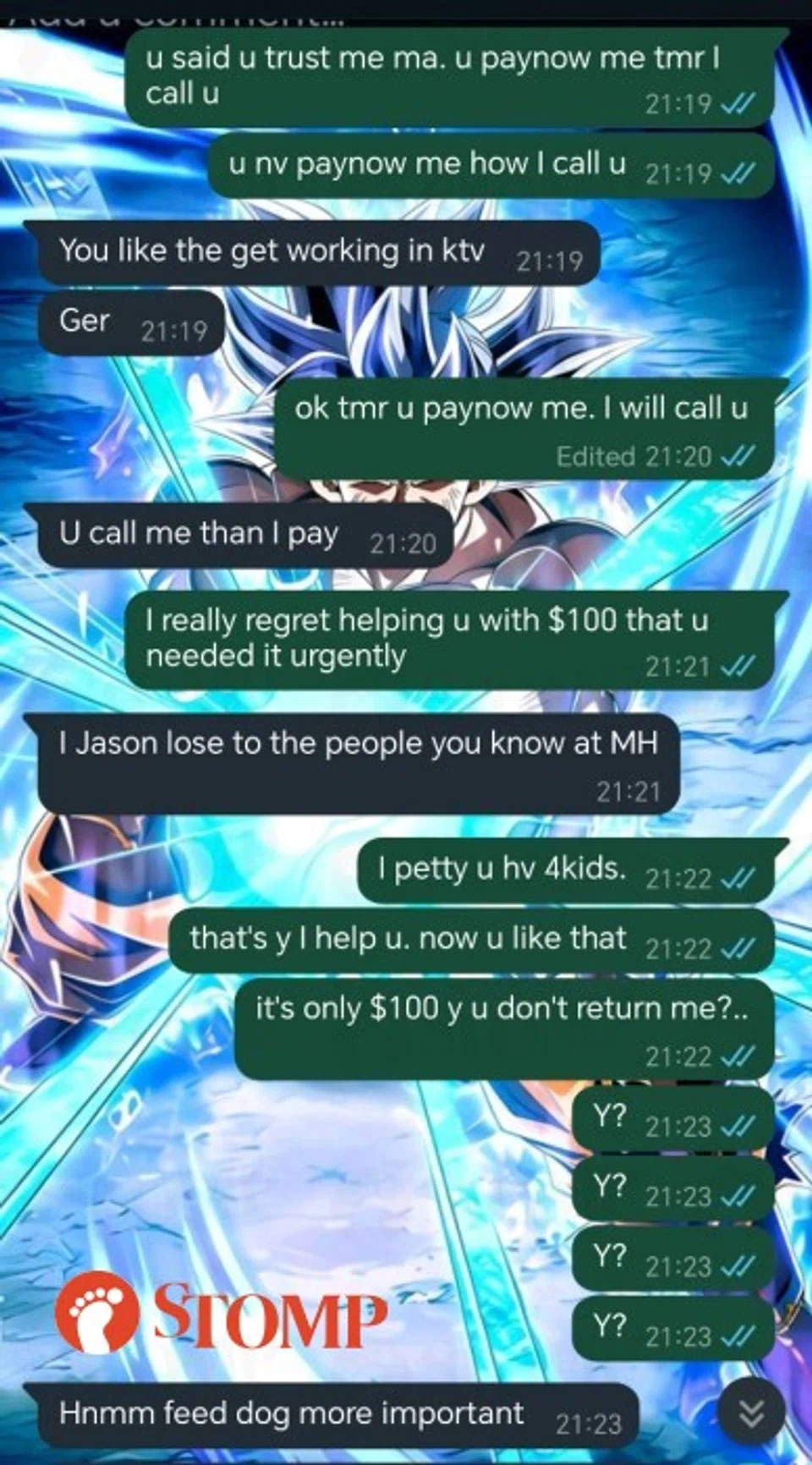 "But I told him I was busy with work and kids. I asked him if he could 'Paynow' me. He got angry and said, 'You pay tips $100. Now want to chase me for $100?'"