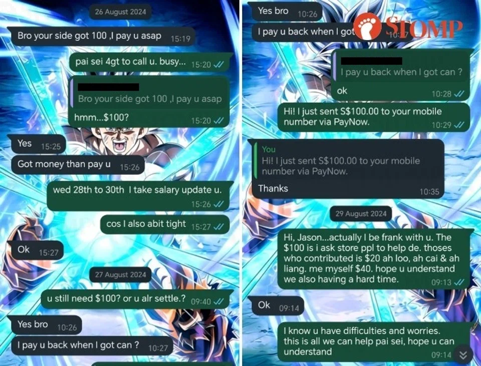Stomper Ang shared screenshots of the online chat between him and his friend Jason where Jason asked for $100 and said he would pay it back as soon as possible.