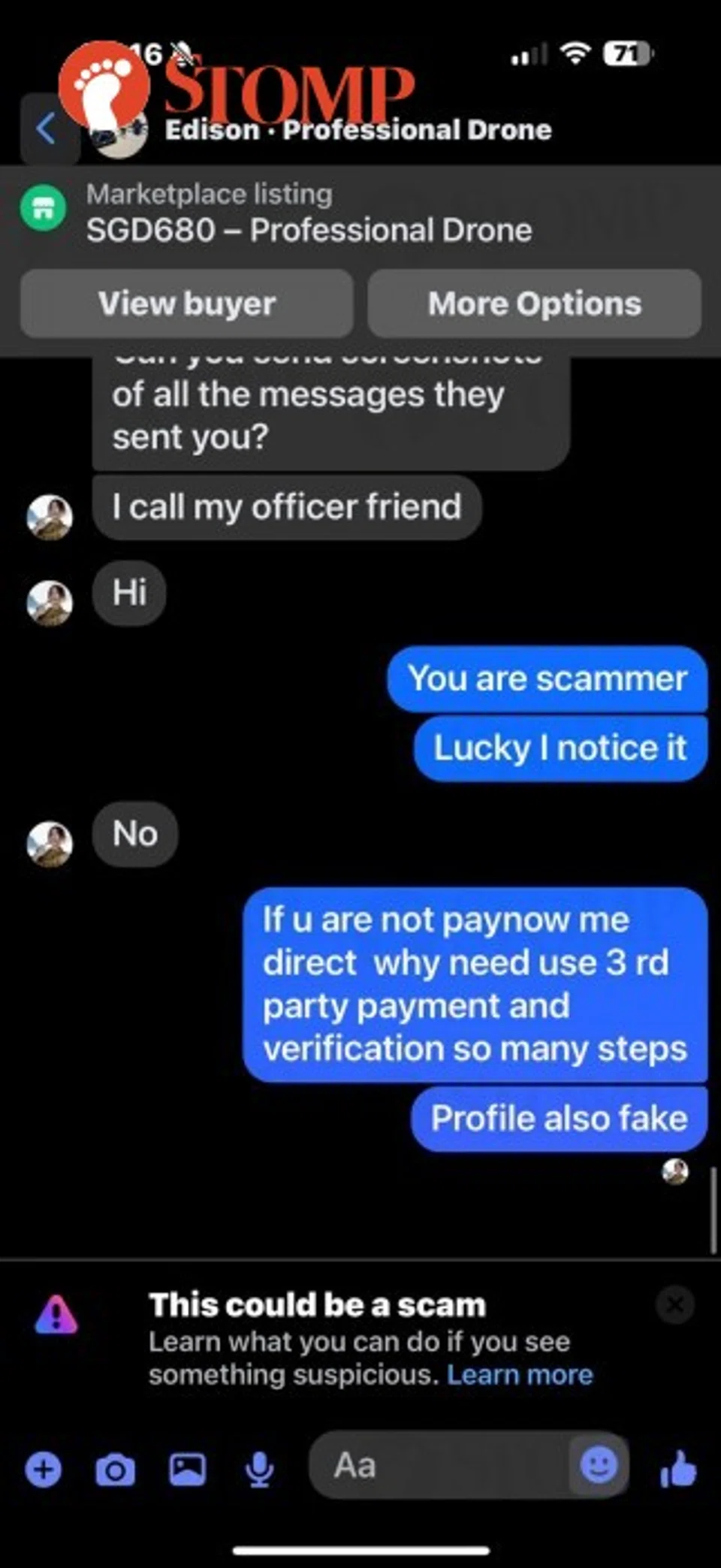 At the end of the conversation, the buyer claimed the money was "stolen" and that he would contact the police, but the Stomper accused him of attempting to scam him.