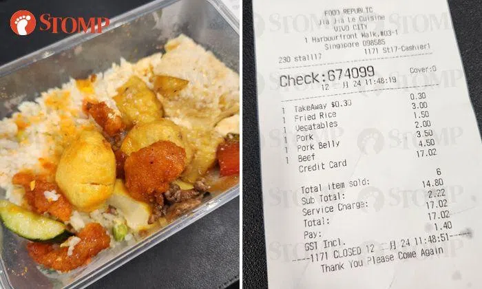 That was the question posed by Stomper Disgruntled Customer after he was hit by a $17.02 bill for his meal at VivoCity's food court on Feb 12. He had ordered rice with four dishes from Jia Jia Le Cuisine at Food Republic.