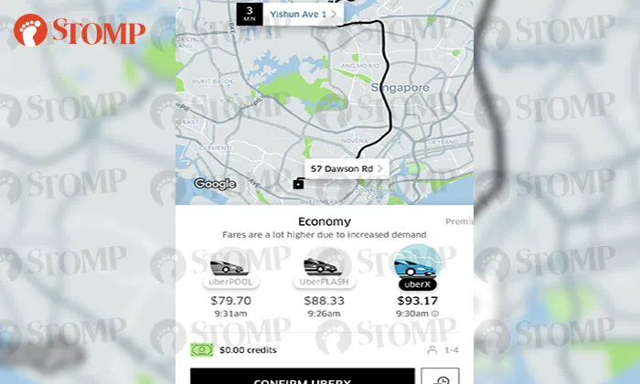 Stomper Ricky was shocked when he saw that Uber fares were as high as $93, while trying to book a ride from Yishun to Dawson Road near Queenstown on Thursday (April 19) morning.