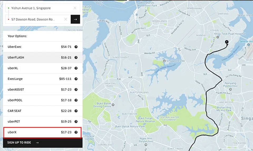 According to the Uber website, a fare estimate for an UberX ride from Yishun to Dawnson Road today morning (April 20) costs between $17 and $23.