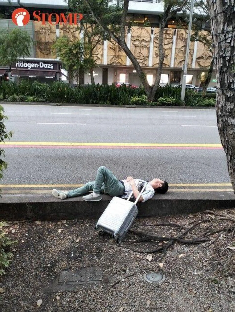 A man was spotted sleeping on the side of Orchard Road with his arm around the handle of his luggage at 7.30am on Sunday (Jan 15).